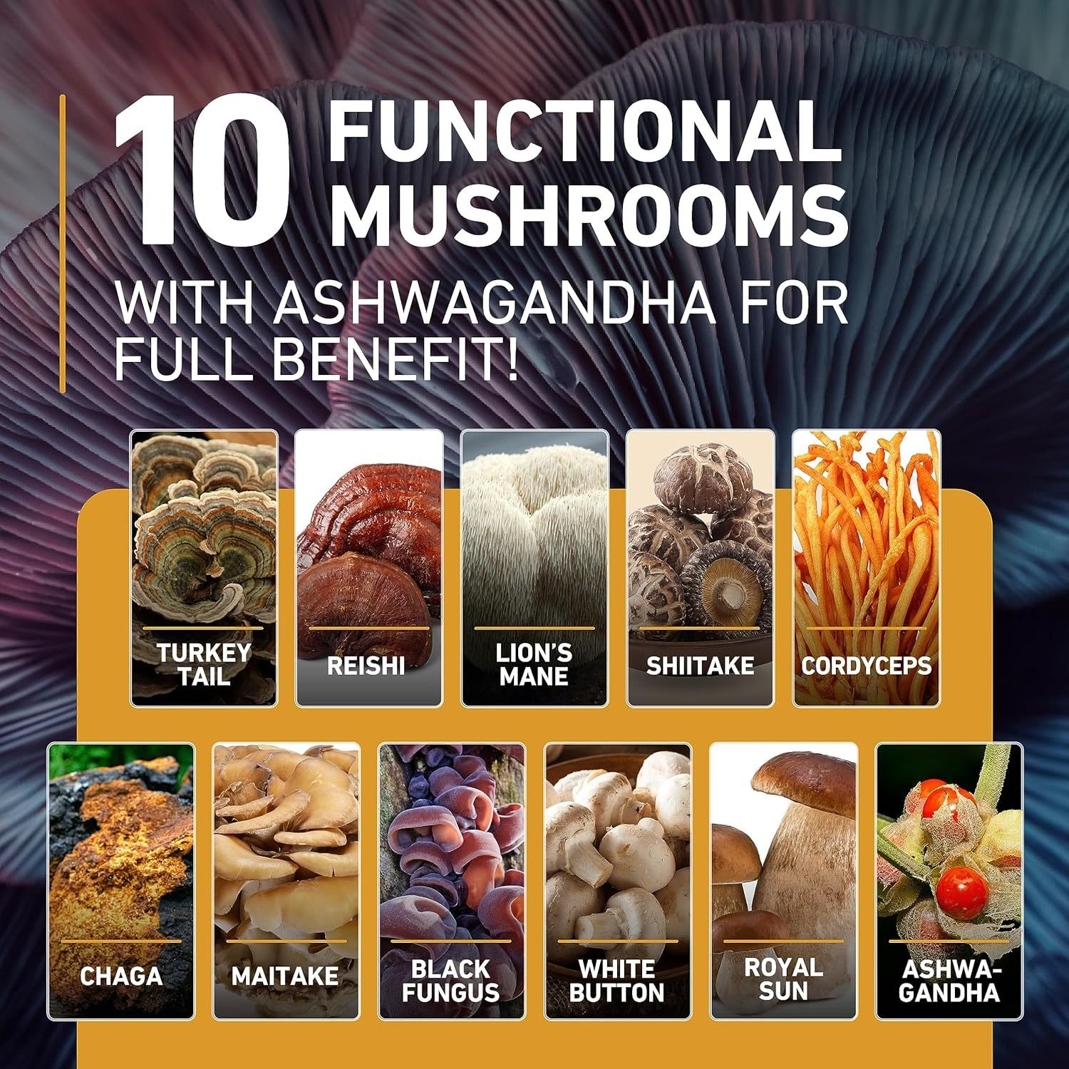 1.Trametes versicolor (Turkey Tail) 2.Ganoderma lucidum (Reishi) 3. Hericium erinaceus (Lion’s Mane) 4.Lentinula edodes (Shiitake) 5.Cordyceps militaris 6. Inonotus obliquus (Chaga) 7.Grifola frondosa (Maitake) 8. Auricularia auricula (Black Fungus) 9. Agaricus bisporus (White Button) 10.Boletus edulis (Royal Sun) 11.Withania somnifera (Ashwagandha)